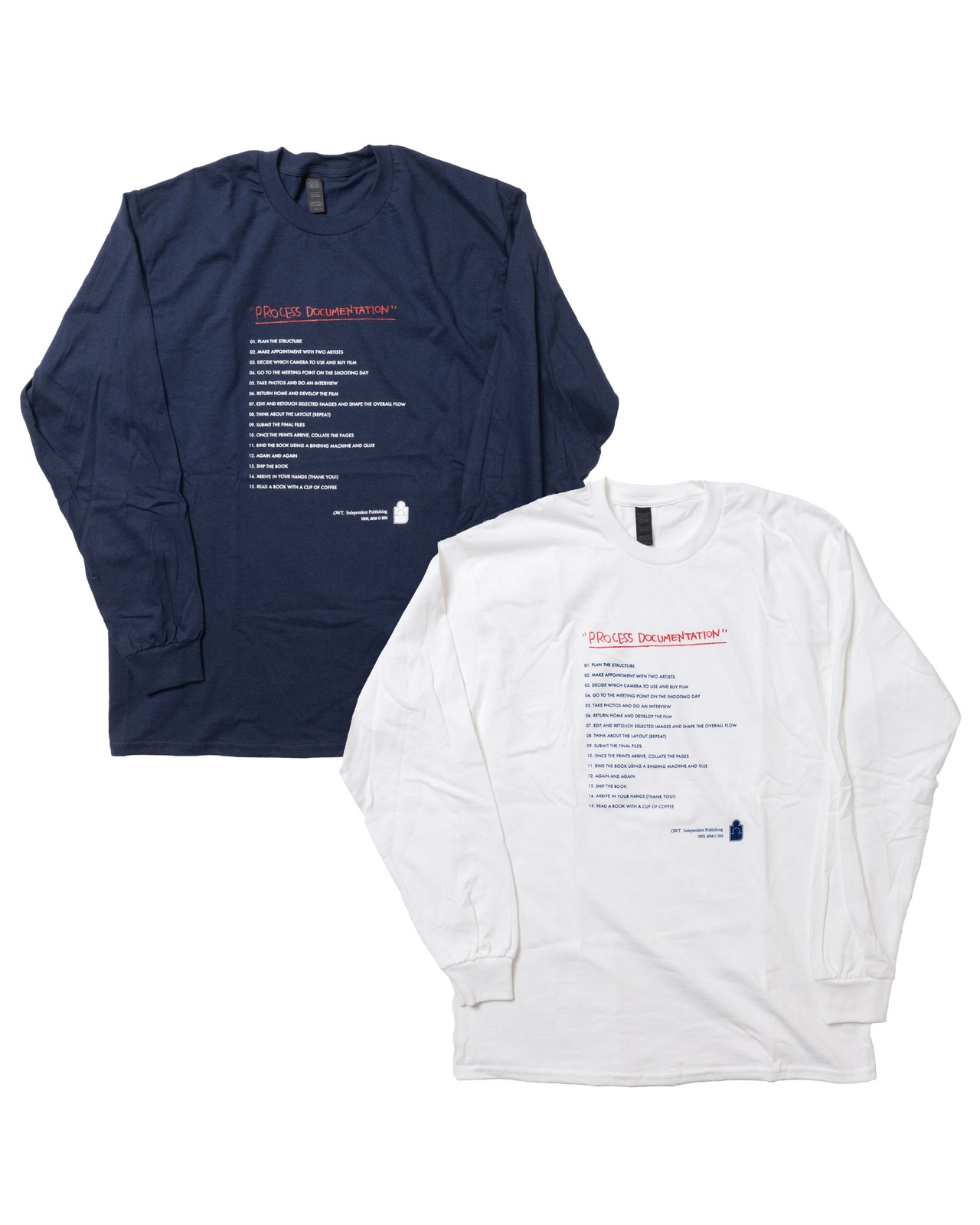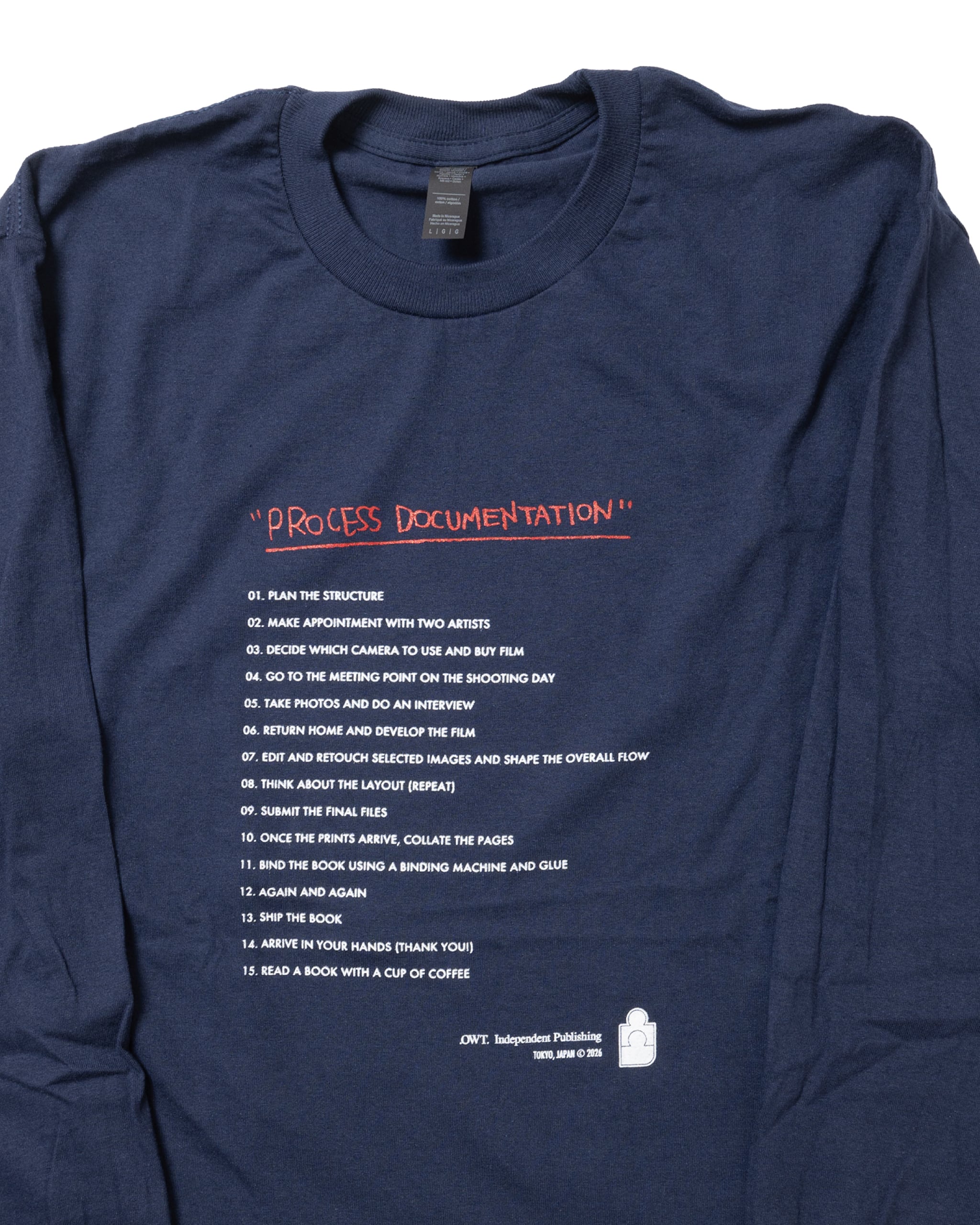 本誌が紙面を形にして皆様の元にお届けするまでの工程をざっくりと書き出したテキストを厚めに手刷りシルクプリントをフロントに施したロングスリーブTEEを少量制作しました。